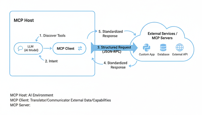 - Intercambio de Información: El LLM (a través del MCP Client) descubre herramientas en los MCP Servers. Cuando necesita realizar una acción o acceder a datos, envía una solicitud estructurada (ej. JSON-RPC 2.0) al MCP Server apropiado, que ejecuta la lógica y devuelve una respuesta estandarizada.